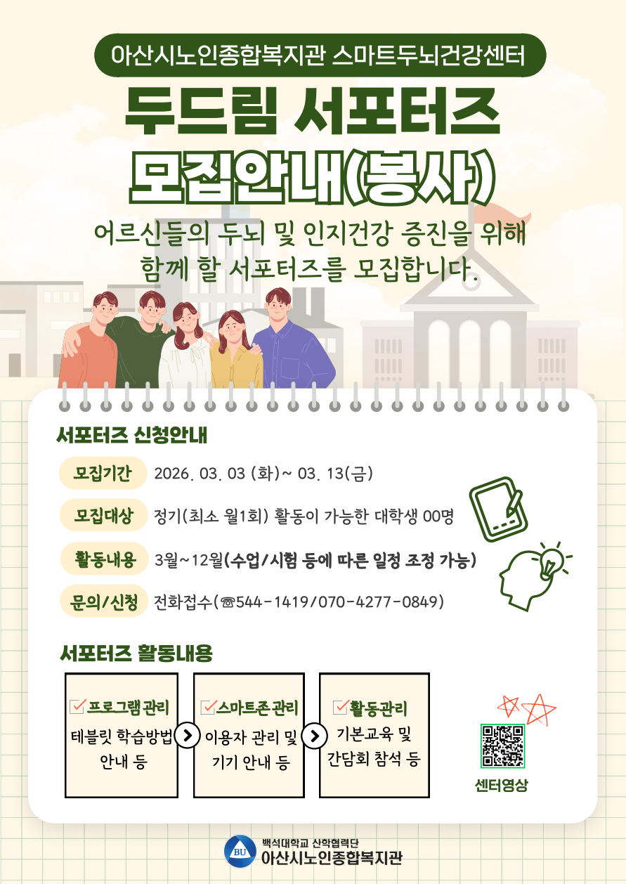 [아산시노인종합복지관] 2026년 스마트두뇌건강센터 두드림 서포터즈(자원봉사자) 모집