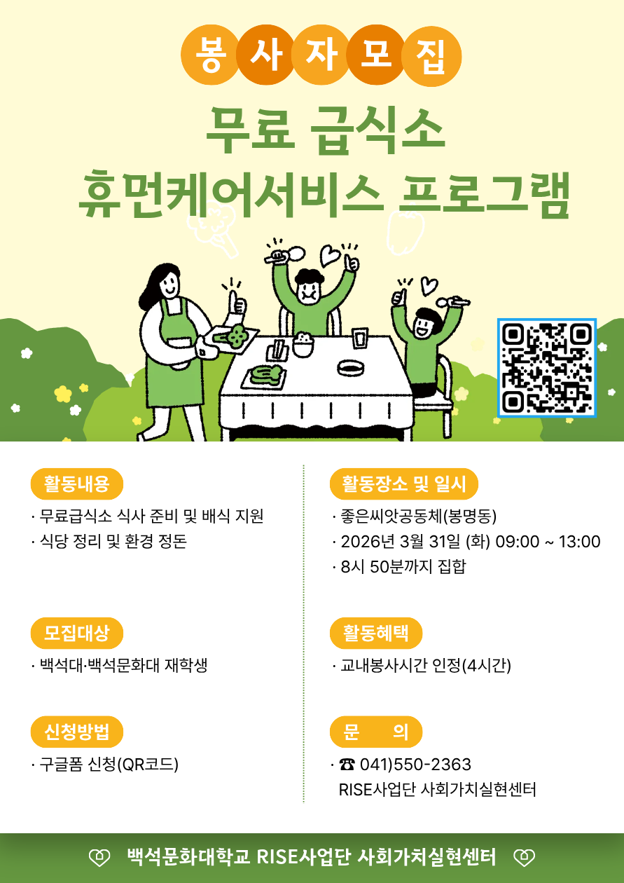[RISE사업단] 무료급식소 휴먼케어서비스 프로그램 봉사자 모집 안내(모집마감)
